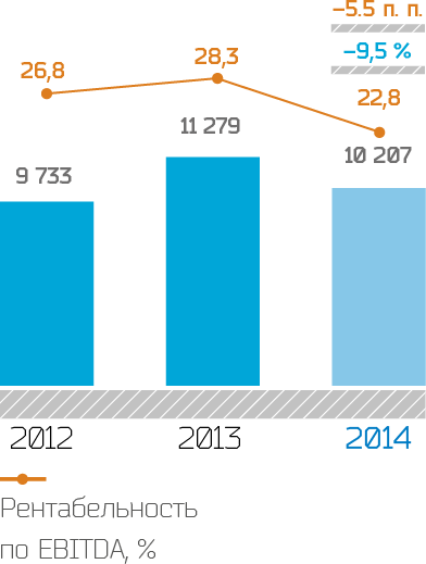 По итогам 2014 г. показатель EBITDA, характеризующий генерируемый Компанией денежный поток до уплаты налогов и процентов, составил 10 207 млн руб., что ниже уровня 2013 г. на 1 072 млн руб., или на 9,5%. Снижение показателя произошло за счет увеличения отрицательного сальдо прочих доходов и расходов без учета процентов к уплате и получению и расходов по созданию резерва под обесценение финансовых вложений (на 3 776 млн руб.) — в основном за счет увеличения отрицательного сальдо по резервам по прочим условным обязательствам.