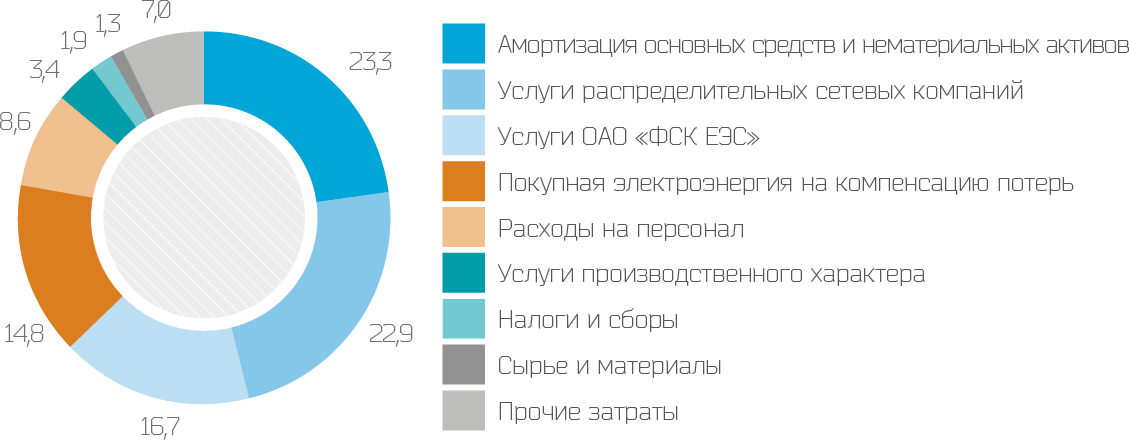 Расходы за услуги ОАО «ФСК ЕЭС» составили 6 566 млн рублей (16,7 % от общих затрат). Снижение в сравнении с 2013 г. в абсолютном выражении составило 149 млн руб. и вызвано в основном сокращением объема заявленной мощности на 363 МВт (9,3 %) в результате ухода части потребителей по присоединениям «последней мили» и ростом стоимости нагрузочных потерь на 50 млн руб. (6,1 %) при одновременном росте тарифов на содержание сетей ЕНЭС и оплату потерь в сетях ЕНЭС.