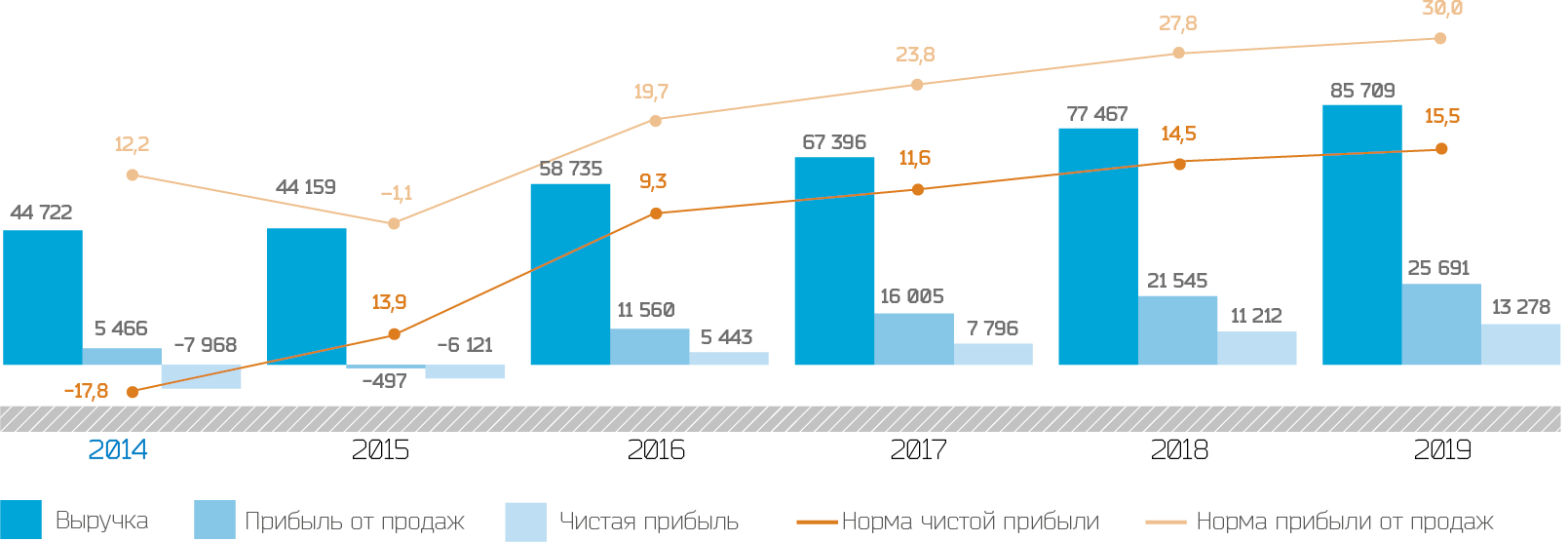 Выручка от реализации по итогам 2014 г. составила 44 722 млн руб., что на 4 820 млн руб. (12,1 %) выше, чем в 2013 г.